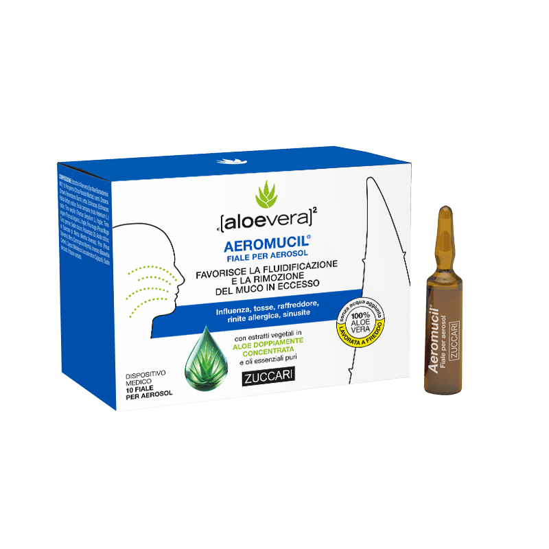 Aeromucil è un dispositivo medico in fiale nebulizzabili tramite apparecchi aerosol. È formulato a base di estratti vegetali di semi di Pompelmo, Drosera, Echinacea, Enula, Timo e Pino mugo in Aloe vera doppiamente concentrata, ed è arricchito con i preziosi oli essenziali puri. La nebulizzazione della soluzione favorisce la fluidificazione del muco in eccesso, facilitandone la rimozione, mentre la presenza dell’Aloe promuove il ripristino delle normali condizioni fisiologiche delle mucose delle prime vie aeree.